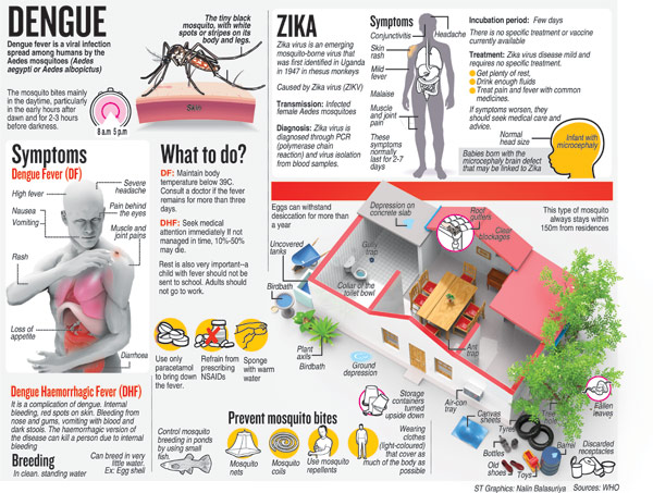 Cả hai biện pháp kiểm soát cần được thực hiện đồng thời để việc phòng chống mang lại hiệu quả. Điều này có thể đạt được bằng cách giảm số lượng các nơi chứa nước nhân tạo là những nơi chứa nước (bể chứa xi măng để dự trữ nước, các thùng hình ống, lốp xe đã qua sử dụng, chai rỗng, vỏ dừa) ở trong nhà và xung quanh nhà và sử dụng các rào cản như rèm cửa chắn côn trùng, cửa số và cửa chính đóng kín, quần áo dài và sử dụng kem xua đuổi côn trùng, các sản phẩm phun sương trong nhà, hương cuộn xua muỗi và phun không gian với thuốc diệt muỗi có thể được triển khai như một biện pháp khẩn cấp. Để bảo vệ tránh muỗi Aedes spp. (vector chính lây truyền), nên ngủ trong màn có tẩm hóa chất hoặc không tẩm hóa chất (đặc biệt là trẻ nhỏ, người ốm hoặc người già).