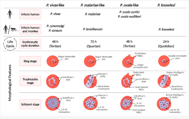Hình 8. Đặc điểm các loài Plasmodium non-falciparum trong chu kỳ hồng cầu