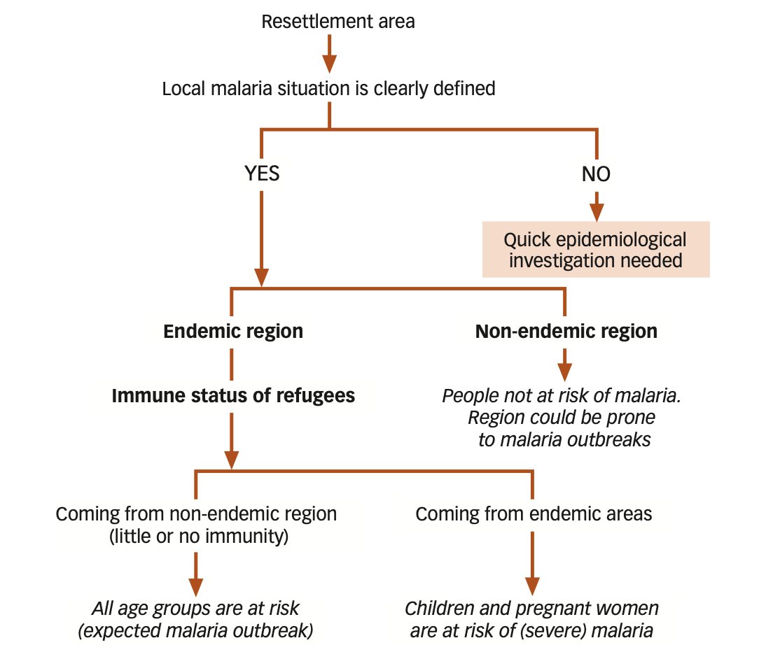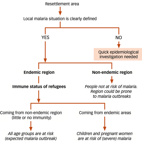 Trong bối cảnh này, TCYTTG khuyến nghị phải cân nhắc sốt rét là một ưu tiên hàng đầu trong mọi phản ứng nhân đạo, bất kể bệnh có được phân loại là dịch hay không. Các biện pháp cần tập trung vào bảo đảm chẩn đoán và điều trị sớm, cung cấp màn tẩm hóa chất cho các hộgia đình, và duy trì các dịch vụ y tế tối thiểu để giảm tử vong do sốt rét.