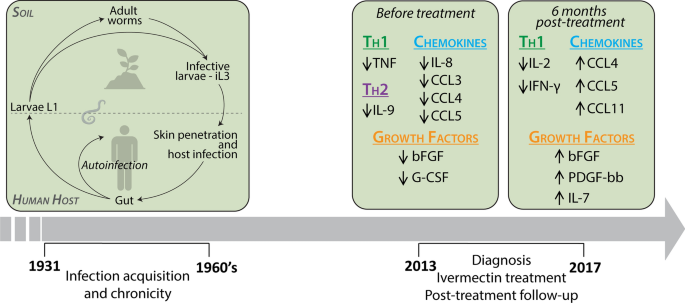 Bệnh nhân được điều trị bằng albendazole 400 mg uống 2 lần/ngày và ivermectin liều 200 mcg/kg tiêm dưới da mỗi ngày để điều trị nhiễm S. stercoralis lan tỏa , cũng như kháng sinh điều trị viêm màng não do E. coli. Ban đầu, bệnh nhân không có dấu hiệu cải thiện thần kinh, hình ảnh chụp CT và MRI não lặp lại cho thấy “dấu tăng cường” màng não ở cả hai vùng lồi não phù hợp với tình trạng viêm màng não đang diễn ra, cũng như các khối u dưới màng cứng mới dọc theo vùng lồi não phải và nhồi máu vỏ não. Bệnh nhân bị suy giảm chức năng thần kinh nghiêm trọng, phải nằm viện hơn 1,5 năm. Quá trình điều trị phức tạp do huyết khối tĩnh mạch đầu hai bên, xuất huyết tiêu hóa trên kèm loét do stress, nhiễm trùng Clostridium difficile và nhiễm trùng huyết tái phát với nhiều loại vi khuẩn khác nhau. Ông đã được điều trị ngắt quãng bằng IVM đường uống nhưng không tái phát. Cuối cùng, bệnh nhân đã qua đời vào tháng 4 năm 2016 mà không được khám nghiệm tử thi.