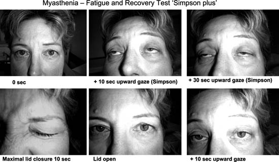 Nếu để cho người bệnh ở trạng thái nghỉ tuyệt đối một thời gian ngắn, sau đó yêu cầu họ thực hiện các động tác luân phiên nhau như mở mắt rồi nhắm mắt, hay duỗi rồi co các ngón tay, sau một số động tác vận động trở nên càng khó khăn và lát sau không thể nào thực hiện được, bệnh nhân không còn khả năng giữ cho các mi mắt trên ở trạng thái bình thường, mà bị sa mi.