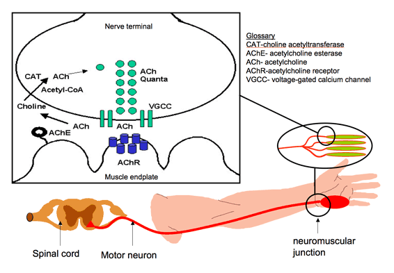 Bệnh nhược cơ gây ra bởi một khuyết tật trong dẫn truyền bó mạch thần kinh cơ. Nó xảy ra khi truyền tin bình thường giữa thần kinh và cơ bị gián đoạn tại điểm nối thần kinh cơ (neuromuscular junction)-nơi mà các tế bào thần kinh nối với cơ để điều khiển. Bình thường khi cơ đẩy tới thần kinh, các đầu mút thần kinh ly giải một chất dẫn truyền thần kinh gọi là acetylcholine. Acetylcholine đi đến điểm nối thần kinh cơ và gắn với thụ thể acetylcholine, khi đó sẽ hoạt hóa và sinh ra sự co cơ.