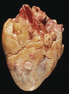 Nếu các triệu chứng tim mạch xuất hiện cùng với đặc điểm của khối xơ hóa cử lao (tuberous sclerosis), có thể đó là các khối u lành tính. Điều này có thể xác định bởi siêu âm tim hoặc chụp mạch tim. Điều trị phẩu thuật các nốt thường không hiệu quả và tiên lượng nghèo nàn sau năm đầu tiên của cuộc sống. Các triệu chứng của khối u ở tim gây ra do sự lan rộng của một khối u ác tính từ một phần cơ thể, gồm có: