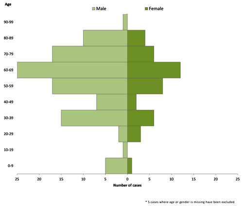 Phân bố số ca mắc cúm A (H7N9) theo độ tuổi và giới tính (từ tháng 5 đến 19/12 2013 (n=142*) |