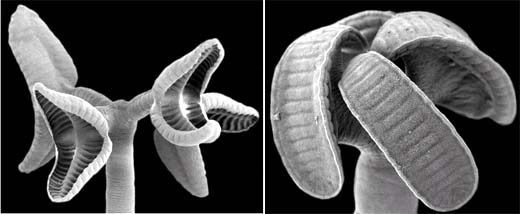 Hình trên là ảnh chụp qua kính hiển vi điện tử quét, đầu sán Rhinebothrium sp. rộng khoảng 300 µm. Loài sán này, giống như tất cả các loài sán rhinebothriidean, có 4 chân bám trên đầu sán, mỗi một chân mọc ra từ một cái cuống.