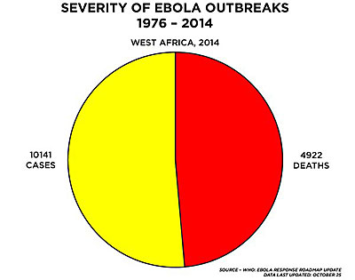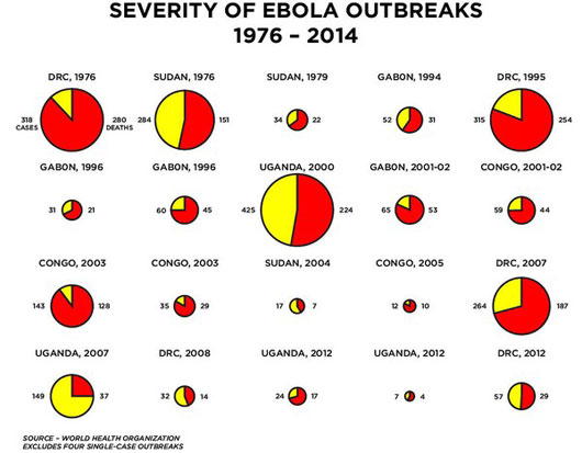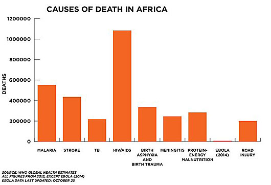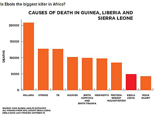 | | Nguyên nhân tử vong do Ebola: Theo biểu đồ thì Ebola không phải là nguyên nhân tử vong nhiều nhất, Chỉ tính riêng tại 3 nước Tây Phi nguyên nhân tử vong nhiều nhất là sốt rét (hơn 20.000 người chết sốt rét từ năm 2012-2014) và HIV/AIDS (hơn 1 triệu người chết từ năm 2012-2014). |