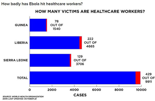 | Số nhân viên y tế nhiễm Ebola trong năm 2014 Đã có 429 nhân viên y tế nhiễm Ebola trong số 13.703 ca mắc tại 3 nước Tây Phi |