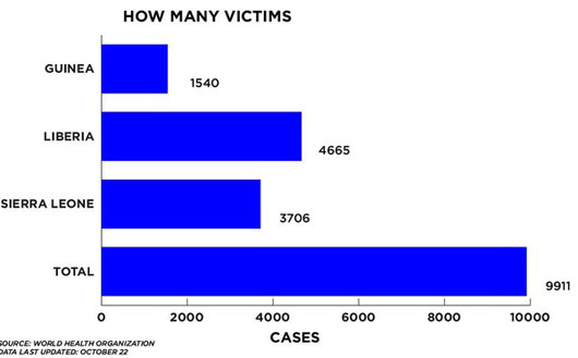 WHO đã điều chỉnh số ca mắc Ebola tăng thêm trên 3.000 bệnh nhân lên thành tổng số 13.703 ca mắc do báo cáo trước đó không đầy đủ, còn số tử vong do Ebola vẫn giữ ở mức 4.920 thay vì 4.922, trong đó 4.910 tử vong ở 3 nước Tây Phi và 10 tử vong ở các quốc gia ngoài Tây Phi. Như vậy theo báo cáo mới nhất của WHO, tổng số ca mắc ở Liberia tăng từ 4,655 thành 6,535 nhưng tử vong do Ebola lại giảm từ 2.705 xuống 2.413 người, trong khi đó con số tử vong ở Guinea tăng từ 926 thành 997 người và Sierra Leone tăng từ 1.281 thành 1500 người. Nhận xét về số mắc tăng và số tử vong giảm ở Liberia, tiến sĩ Aylward cho biết đã có "một bước tiến thực sự trong công việc chôn cất an toàn các nạn nhân Ebola” (a real step up in the work to put in place safe burials). Tổng thống Mỹ Barack Obama cũng ca ngợi những tiến bộ đạt được ở Liberia nhưng cảnh báo đây vẫn là một ổ dịch đáng kể và nghiêm trọng và nhân loại vẫn phải đi một chặng đường dài trong sự nghiệp chống Ebola. Để đóng góp cho cuộc chiến chống Ebola, ngày 29/10 tỷ phú Patrice Motsepe, trùm khai thác mỏ của Nam Phi đã tặng Guinea 1 triệu USD để giúp nước này chống lại Ebola.