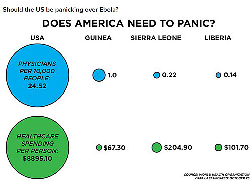 | | Theo WHO, Mỹ là quốc gia có tỷ lệ bác sĩ trên 10.000 dân cao nhất thế giới với 24,5 bác sĩ/10.000 dân và chi phí chăm sóc sức khỏe đầu người là 8.895USD (khoảng 190 triệu đồng); trong khi tỷ lệ này tại Guinea là 1/10.000, Sierra Leone là 0,22/10.000 và Liberia là 0,14/10.000. Số tiền bình quân 1 người sử dụng dịch vụ y tế ở Mỹ là 67,3USD (khoảng 1,5 triệu đồng) còn ở Guinea là 204USD (khoảng 4,3 triệu đồng) ở Siera Leone và Liberia 101USD (khoảng 2 triệu đồng). |