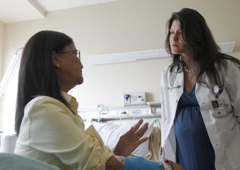 Tiến sĩ Sarah K. Browne (phải) đang trò chuyện với một bệnh nhân mắc căn bệnh lạ giống AIDS ngày 22/8. Ảnh: AP