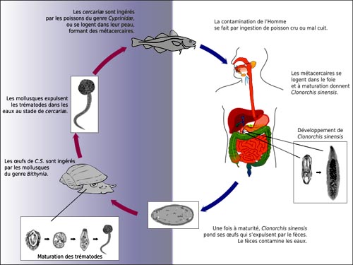 Con người bị nhiễm thông qua việc tiêu thụ cá sống hoặc chưa được nấu chín hoàn toàn, hoặc ăn các loài động vật giáp xác và rau thủy sinh nhiễm ấu trùng sán lá đang vốn dĩ ký sinh.