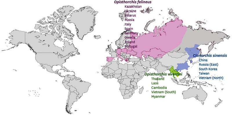 Clonorchis và Opisthorchis là hai giống chị em thuộc họ Opisthorchiidae. C. sinensis là tác nhân gây bệnh SLGN, trong khi O. viverrini và O. felineuscũng gây ra bệnh SLGN (Opisthorchiasis). Đây là các bệnh sán lá gan ở người lây truyền qua việc ăn cá được tìm thấy chủ yếu tại Đông Á, trải dài từ vùng Viễn Đông nước Nga đến miền Bắc Việt Nam, trong khi O. viverriniđươc tìm thấy tại bán đảo Đông Dương và O. felineus phân bố rộng rãi từ vùng Siberia của Nga đến châu Âu (Hình 4). Sự phân bố tách biệt của ba loài sán này phản ánh các đặc điểm sinh học khác nhau giữa chúng. Tại Hàn Quốc, chỉ có bệnh SLGN “Clonorchiasis”được lây truyền tại các khu vực gần sông, suối và hồ (và trong bài viết này chủ yếu tập trung bệnh sán lá gan nhỏ do C. sinensis là chính)