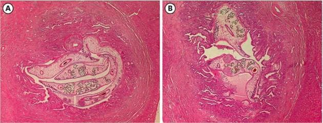 (A, B) Các ống mật bị nhiễm sán cho thấy tình trạng giãn nở, tăng sản tuyến (adenomatous hyperplasia), dị sản tiết chất nhầy (mucin-secreting metaplasia), viêm và xơ hóa.