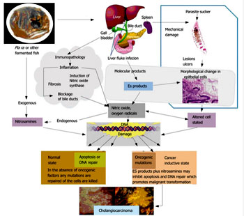 Hình 2. Cơ chế sinh ung thư biểu mô đường mật liên quan đến sán lá gan nhỏ Opisthorchis viverrini |Nguồn: Banchob Sripa, 2023