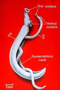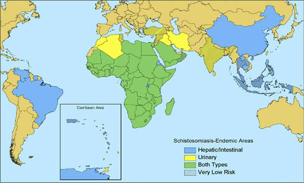 Sán máng ruột (Intestinal schistosomiasis) | Schistosoma mansoni | Châu Phi, Trung Đông, vùng biển Caribbean, Brazil, Venezuela,Suriname |