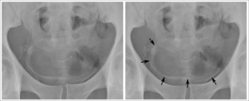 Tình trạng calci hóa hay dày cứng thành bàng quang trên phim chụp x quang thẳng vùng chậu, trên một ca nam giới 44 tuổi vùng Sahara. Điều này do sán máng ở hệ niệu. Nhiễm trùng liên tục có thể gây ra phản ứng u hạt và xơ hóa trong các cơ quan bị nhiễm phải, và khi đó biểu hiện triệu chứng bao gồm: