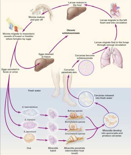 Sau khi xâm nhập vào trong cơ thể, ấu trùng phát triển thành Schistosomes trưởng thành. Sán trưởng thành sống trong các hệ mạch máu và tại đây con đưc và con cái giao phối, những con cái đẻ trứng. Một số trứng được đào thải ra khỏi cơ thể thông qua phân hoặc nước tiểu để tiếp tục vòng đời của loài ký sinh trùng. Những trứng khác kết dính trong các mô cơ thể, gây ra một phản ứng miễn dịch, tạo nên các u hạt, gây nguy hiếm đến các cơ quan.