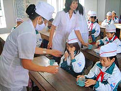 Nhân viên y tế đang cho học sinh tiểu học uống thuốc tẩy giun |