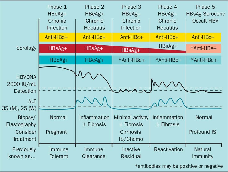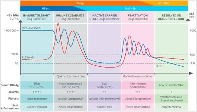 Hình 3. Diễn biến tự nhiên và các giai đoạn của viêm gan B mạn tính từ nhiễm trùng dương tính với kháng nguyên HBeAg đến giai đoạn khỏi bệnh hoặc nhiễm trùng tiềm ẩn. ALT=Alanine aminotransferase; cccDNA = DNA vòng khép kín cộng hóa trị; HbeAg(-) = âm tính với kháng nguyên e; eAg+ = dương tính với kháng nguyên e; HBsAg = kháng nguyên bề mặt viêm gan B; HBV = virus viêm gan B; LLOD = mức phát hiện thấp nhất; ULN = giới hạn trên của mức bình thường.