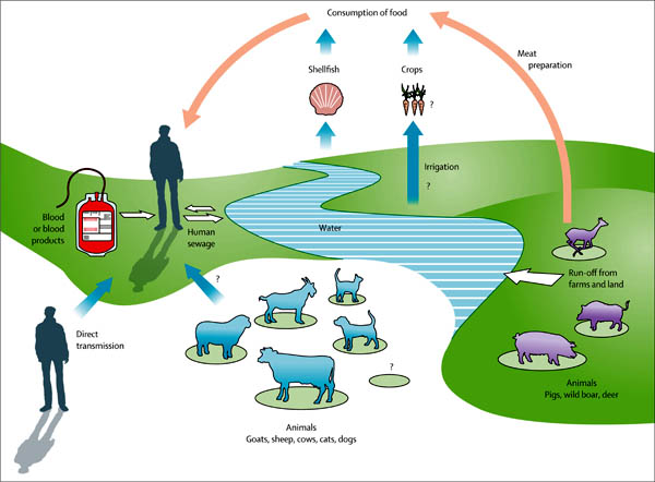 Cơ chế lây truyền có vẻ như đang thay đổi vì HEV đang nổi lên như một bệnh virus lây truyền từ động vật. Ở các nước phát triển, các bác sĩ đã từng nhìn thấy HEV ở những người du lịch trở về từ các vùng lưu hành. Tuy nhiên, hiện nay thì con người nhiễm bệnh này từ lợn và các sản phẩm thịt lợn (thông qua việc ăn thịt hoặc phân ô nhiễm) ở các quốc gia như Anh và Pháp.