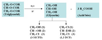 Trong nguyên liệu sản xuất nước tương có 2 thành phần chính là protein và chất béo từ bánh dầu đậu phộng (hoặc bã đậu nành). Khi nấu ở nhiệt độ trên 1000C phản ứng thuỷ phân xảy ra, phân giải các mạch protein thành các chất bổ dưỡng là các acid amin. Đồng thời chất béo cũng được thuỷ phân thành glycerol (còn gọi là glycerin) và acid béo. Glycerol tham gia phản ứng thế với gốc Clo của acid clohric (HCl) tạo thành 3-MCPD và 1,3-DCP. Phương trình phản ứng như sau: