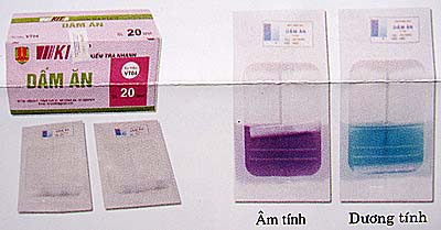 Thử nghiệm có ký hiệu VT 04. Kỹ thuật thực hành đơn giản, lấy một túi thử có ký hiệu VT 04, dùng kéo cắt ngang mép trên của túi ở phía trên của nhãn. Đổ mẫu dấm cần kiểm tra vào túi đến vạch định mức thứ hai từ dưới lên. Sau đó dùng tay bóp vỡ ống thử ở đáy túi và lắc đều. Phản ứng dương tính nếu dung dịch trong túi chuyển sang màu xanh lơ giống màu chuẩn dương tính in trên nhãn, có thể kết luận trong mẫu dấm có acide vô cơ. Phản ứng âm tính nếu dung dịch trong túi có màu tím giống màu chuẩn âm tính trên nhãn. Cần chú ý kết quả thử nghiệm tùy thuộc vào nồng độ acide vô cơ mà phản ứng sẽ cho màu sắc khác nhau. Nếu dấm được pha từ acide acetic 5% thì dung dịch phản ứng chuyển màu hơi tím xanh. Nếu dấm được sản xuất từ gạo 100% thì dung dịch có màu tím rõ. Thực tế thử nghiệm với acide acetic đậm đặc 99%, kết quả phản ứng vẫn có màu tím.