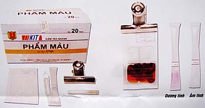 Sau đó tiếp tục các bước còn lại. Bước 6: cắt bỏ bao bộ thuốc thử, lấy ống CV1, CV2 và giấy thử ra ngoài. Bước 7: lấy một mẫu bông cho vào đĩa, dùng ống bơm tiêm có lắp đầu cônlấy 0,2ml “dung dịch pha” ứng với vị trí pít tôngngang vạch thứ hai trên ống bơm tiêm; bơm vào mẫu bông, dùng panh kẹp bông lau khắp đáy đĩa để thu chất chiết vào trong bông. Chú ý cần lau khắp bề mặt của đĩa để thu hết chất đã chiết được. Bước 8: lấy ống bơm tiêm lắp một đầu côn khác, cắm đầu côn vào cục bông để hút dịch trong bông vào đầu côn, khi bông gần khô, lau lại đáy đĩa để thu hết các giọt còn lại; sau đó hút tiếp cho đến khi bông khô hẳn. Thu được dung dịch chiết mẫu. Cho toàn bộ dịch này vào ống CV1. Đậy nắp, lắc dọc theo thân ống 1 phút, sau đó để cho phản ứng 30 phút. Bước 9: dùng ống bơm tiêm và đầu côn khác lấy 0,1ml “dung dịch pha”, tương ứng với pít tông cao su chạy đến vạch thứ 1, cho vào ống CV2, lắc kỹ cho tan; sau đó hút hết dung dịch cho vào ống CV1, lắc đều, để 5 phút. Bước 10: mở gói giấy thử, dùng panh gắp mẫu giấy màu xanh cho vào ống CV1, đọc kết quả sau 3-5 phút. Chú ý trong ống CV1 và CV2, thuốc thử ở trên nắp, do đó khi mở nắp cần nhẹ nhàng; khi lắc cần lắc dọc thân ống để hóa chất trên nắp hòa tan hết. Chỉ đọc kết quả tại thời điểm 4 phút, quá thời gian nói trên, kết quả sẽ không còn chính xác.