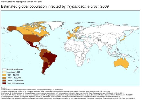 Di dân hàng loạt của người bị nhiễm bệnh mạn tính và những người nhiễm bệnh không có triệu chứng đã gây ra toàn cầu hóa bệnh Chagas nghĩa là thông qua sự di cư bệnh đã mở rộng vùng phân bố mà trước đây chưa hề bị bệnh và đã lây nhiễm không thông qua véc tơ truyền bệnh, bao gồm cả lan truyền theo chiều dọc từ mẹ sang con và lan truyền bệnh qua đường truyền máu, đây là mối đe dọa đối với cộng đồng nhiều hơn các trường hợp nhiễm do véc tơ truyền.Trên cơ sở dựa vào cư dân địa phương và chưa đầy đủ điều tra huyết thanh, hiện nay số lượng bệnh nhân Chagas sống ở Nhật Bản vào khoảng 4.500 người, so với Mỹ là hơn 100.000 và Tây Ban Nha hơn 6.000 bệnh nhân. Trong thập kỷ qua, các ca bệnh nhập khẩu rãi rác đã được ghi nhận và báo cáo tại Nhật Bản, nhưng tỉ lệ mắc bệnh chính xác là không rõ. Hầu hết các ca bệnh được chẩn đoán chỉ sau khi bệnh nhân có biến chứng nghiêm trọng, trong đó có sự liên quan đến bệnh tim nặng. Có thể hiểu rằng bệnh nhân có các triệu chứng liên quan đến tim ít nghiêm trọng hoặc liên quan đến hệ tiêu hóa đã được điều trị tại bệnh viện địa phương ở Nhật Bản, nơi mà thiếu khả năng phát hiện hoặc chẩn đoán sai bệnh là rất cao. Tại Nhật Bản, những khó khăn trong việc đưa ra mộtchẩn đoán chính xác bệnh Chagas là rất phức tạp, bởi hiểu biết và xác định bệnh của nhân viên y tế còn hạn chế; khan hiếm nguồn dữ liệu về dịch tễ học hoặc thống kê và thiếu các công cụ chẩn đoán, nguồn lực và phương tiện sẵn có để giúp chẩn đoán phân biệt với các bệnh khác.