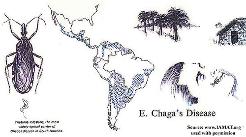 Bệnh lây truyền qua loài ký sinh trùng Trypanosoma cruzi, điều này lây truyền từ các động vật sang người qua vector côn trùng và tìm thấy chỉ ở châu Mỹ (chủ yếu các vùng nông thôn của châu Mỹ latin – nơi mà đói nghèo lan rộng. do đó, bệnh Chagas còn có tên gọi khác là bệnh American trypanosomiasis (CDC, 2013).