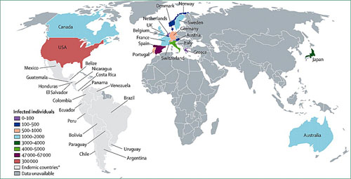 Bệnh Chagaslây truyền do tác nhân ký sinh trùng Trypanosoma cruzi, trước đây loài ký sinh trùng này phân bố duy nhất ở khu vực Trung và Nam Mỹ nhưng bây giờ nó phân bố ở nhiều nơi trên thế giới, với ước tính có khoảng 10 triệu người trên thế giới bị ảnh hưởng. Xu hướng gần đây chưa từng có đó là quá trình toàn cầu hóa đã đi kèm với sự di dân khoảng 14 triệu người từ các nước lưu hành bệnh đến các quốc gia thuộc khu vực Bắc Mỹ, châu Âu, Nhật Bản và Úc. Do vậy, có nhiều báo cáo bệnh Chagas mạn tính thỉnh thoảng đã được xuất hiện, các ca bệnh ghi nhận có lẽ nguyên nhân là do những người bị bệnh mạn tính nhập cư từ các quốc gia lưu hành bệnh.