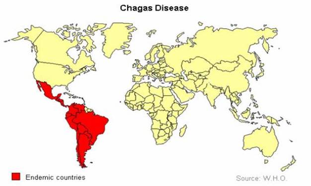Bệnh Chagas không lưu hành tại vùng Caribbe (chẳng hạn không tìm thấy ở Puerto Rico hay Cuba). Các bệnh Chagas lây truyền do côn trùng đã được báo cáo tại phía nam nước Mỹ. Người ta ước tính khoảng 8-10 triệu người tại Mexico, Trung Mỹ và Nam Mỹ có bệnh Chagas, hầu hết họ không biết mình bị nhiễm, nếu không điều trị thì mầm bệnh có thể tồn tại trong cơ thể một thời gian dài và có thể đe dọa đến tính mạng bệnh nhân, điều này cho thấy những người dân di cư từ các vùng lưu hành bệnh có nguy cơ lâu dài và phát triển các biến chứng nặng do bệnh.