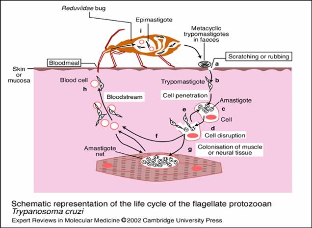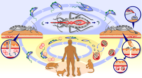 -Trypomastigotes nhiễm vào các tế bào của các mô và chuyển dạng thành dạng amastigotes nội bào bên trong các vị trí nhiễm trùng mới. Các đặc điểm lâm sàng có thể hình thành từ chu kỳ nhiễm này mà sinh ra. Các trypomastigotes trong dòng máu không nhân lên (khác với African trypanosomes). Quá trình sao chép chỉ tiếp tục khi ký sinh trùng đi vào các tế bào khác hoặc bị nuốt bởi một vector khác. Các bọ xít này bị nhiễm do quá trình ăn máu của động vật hoặc người có chứa sẵn ký sinh trùng trong máu (5).