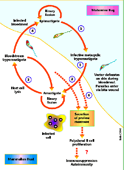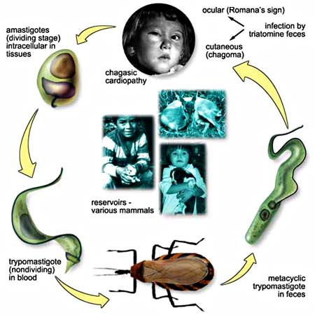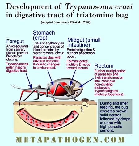 Trong chu kỳ sinh bệnh cần lưu ý một số điểm: các côn trùng bọ xít triatomine hút máu và ly giải các trypomastigotes theo phân ra ngoài dính tại vết thương (da, mắt, kết mạc, vết thương hở vốn có sẵn trên da). Sau khi đi vào cơ thể thì các trypomastigotes xâm nhập vào các tế bào biệt hóa thành amastigote nội bào. Các amastigotes nhân lên và chuyển thành trypomastigote rồi kế đó lý giải vào trong tuần hoàn máu các trypomastigotes. Các đặc điểm lâm sàng từ chu kỳ nhiễm này và sự chết tế bào ở mô đích. Chẳng hạn, kết quả phân tích từ các nhà bệnh học người Úc-Brazil tên là Fritz Köberle vào những năm 1959 tại đại học y khoa São Paulo tại Ribeirão Preto, Brazil, cho thấy các amastigote nội bào đã phá hủy các neuron trong vách ucar hệ thần kinh tự chủ trong ruột và tim, dẫn đến các hiện tượng phì đại ruột (megaintestine) và phình các mạch máu tim (heart aneurysms).