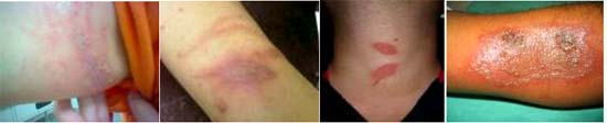 Tổn thương cơ bản: sau khi tiếp xúc với côn trùng, bệnh nhân thấy ngứa, rát, nóng bỏng tại chỗ, sau 6-12 giờ xuất hiện các đám, vết màu đỏ, hơi nề thành vệt, kích thước từ 1-5cm, rộng 3-4 mm, có bờ viền rõ rệt, có vệt có biến sắc màu tím hồng, sau 1-3 ngày xuất hiện các mụn nước trên da đỏ, lấm tấm sau đó xuất hiện bọng nước và bọng mủ (giai đoạn này rất dễ nhầm với các tổn thương như zona, thủy đậu hoặc các mụn virus khác).