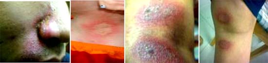 Có trường hợp bệnh nhân có nổi một vết đỏ lấm tấm mụn nước nhỏ, hơi ngứa, tổn thương lặn sau 3-5 ngày không thành phỏng nước, phỏng mủ. Trong mùa mưa một bệnh nhân có thể bị đi bị lại 2-4 lần, trong tập thể có thể có 10-12% người bị, bệnh có thể kéo dài 5-20 ngày;