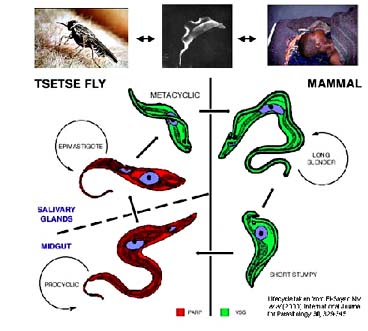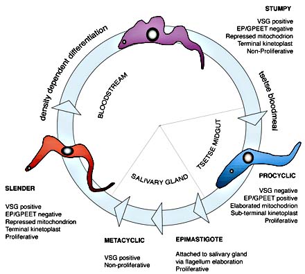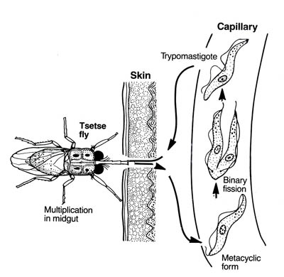Trypanosome (còn gọi là trùng mũi khoan) là những ký sinh trùng có chu kỳ gồm 2 vật chủ: động vật có vú và các loài chân khớp. Chu kỳ sinh trưởng bắt đầu khi các trypanosomes bị tiêu hóa trong bữa ăn máu của các con ruồi tsetse từ một ổ chứa là người bị bệnh West African trypanosomiasis hoặc của động vật bị thể Đông Phi. Các trypanosomes nhân lên qua một thời gian 2-3 tuần trong ruột của ruồi; tiếp đến các trypanosomes di chuyển đến các tuyến nước bọt, ở đó chúng phát triển thành thể trưởng thành epimastigotes. Các metacyclic trypomastigotes nhiễm lên người sau đó. Ổ chứa bệnh đối với các vector này là dành riêng cho người với bệnh trypanosomiasis Tây phi (West African). Tuy nhiên, bệnh trypanosomiasis Đông phi (East African) lại là bệnh lây truyền từ động vật sang người với các vector là các động vật. Bệnh trypanosomiasis châu Phi (African) khác với bệnh trypanosomiasis của châu Mỹ (American), gây ra bởi Trypanosoma cruzi và có những điểm khác về vector, đặc điểm lâm sàng và liệu pháp điều trị.