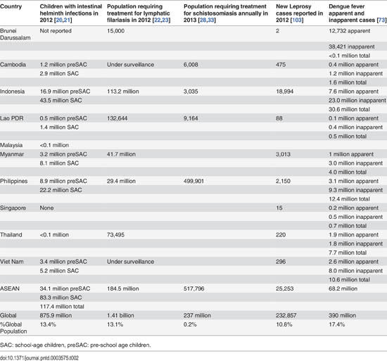 Song, các bệnh NTDs phổ biến ngay cả ở những quốc gia ASEAN có mức thu nhập trên mức trung bình chẳng hạn như Malaysia và Thái Lan, đặc biệt ở những người dân bản địa. Có 3 bệnh nhiễm giun sán đường ruột chính là những bệnh NTDs phổ biến nhất. Mỗi giun sán liên quan đến khoảng 100 triệu người nhiễm trong khu vực. Ngoài ra, có hơn 10 triệu người bị nhiễm sán đường ruột hoặc sán lá gan, cũng như bệnh sán máng và giun chỉ bạch huyết. Nhiễm sinh vật đơn bào đường ruột rất phổ biến, trong khi bệnh Leishmaniasis đã xuất hiện ở Thái Lan và sốt rét lan truyền từ động vật sang người Plasmodium knowlesi - nguyên nhân gây bệnh nghiêm trọng ở Malaysia. Bệnh Melioidosis hay bệnh dòi đã nổi lên như một bệnh NTDs vi khuẩn quan trọng, vì đã nhiễm rickettsial và leptospirosis. Bệnh phong, bệnh cóc ghẻ và bệnh đau mắt hột vẫn lưu hành ở những khu vực trọng điểm trong của ASEAN.