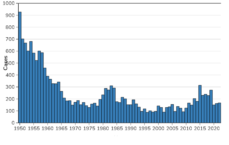 Hình 21. Số ca bệnh được báo cáo hàng năm tại Mỹ giai đoạn 1950-2022 (Nguồn: CDC)