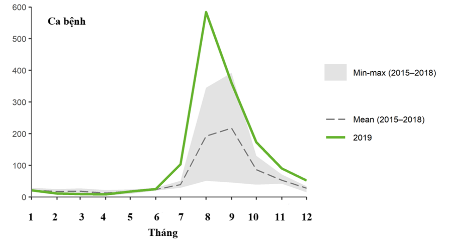 Hình 22. Phân bố ca bệnh theo từng tháng ở các nước châu Âu năm 2019 và trung bình giai đoạn 2015-2018|Nguồn: ECCDC, 2019