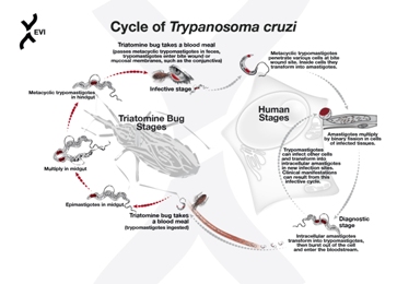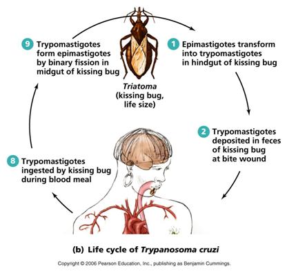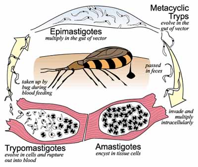 Ở châu Mỹ Latinh, nhiễm ký sinh trùng T. cruzi thường xảy ra thông qua vector truyền do một loại bọ xít Triatomine hút máu (triatomine bugs hoặc “kissing bug”). Triatomines hút máu vào buổi tối và có thể sống ở nhiều môi trường khác nhau, xung quanh nơi ở của con người như các vết nứt, các lỗ trên tường vách, trần nhà và các cấu trúc sàn nhà lụp sụp không đạt yêu cầu. Sau khi hút máu, bọ xít nhiễm thường bài tiết phân có nhiễm ký sinh trùng T. cruzixâm nhập vào vật chủ. T. cruzi có thể xâm nhập thông qua vết đốt hoặc bề mặt niêm mạc xung quanh như kết mạc khi nạn nhân vô tình chà xát các ký sinh trùng trên da[40].