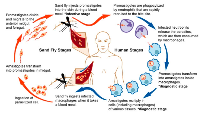Muỗi cát đốt người và động vật hút máu có cả Leishmania spp. vào dạ dày muỗi. Ở dạ dày muỗi cát, từ thể không roi Leishmania spp. biến thành thể có roi Leptomonas, rồi xâm nhập vào các tế bào dạ dày muỗi cát. Ở đây, Leishmania spp. sinh sản vô giới, đạt tới mức số lượng lớn, phá hủy tế bào dạ dày, di chuyển tới họng và vòi muỗi. Khi muỗi cát đốt người và động vật, chúng sẽ truyền các thể có roi vào người và động vật. Tại vật chủ mới, các thể có roi sẽ chuyển thành thể không roi ký sinh và gây bệnh.