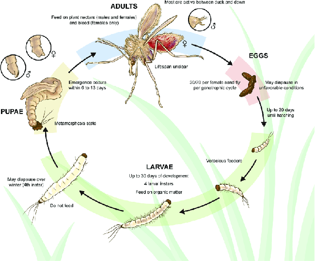 Hình 4. Chu kỳ sinh học và phát triển của muỗi cát bao gồm 4 giai đoạn chính: Trứng (màu cam), ấu trùng (4 lần lột xác instars: màu xanh lá cây), nhộng (màu vàng) và trưởng thành (m