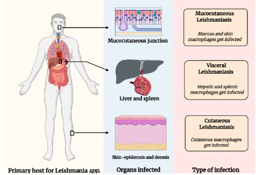 Có nhiều hình thức khác nhau của bệnh do Leishmaniaspp. ở người. Ở một số người, bệnh diễn tiến âm thầm, không có bất kỳ triệu chứng hoặc dấu hiệu nào. Tùy theo nơi định vị của ký sinh trùng đơn bào Leishmania spp., người ta phân biệt được các thể lâm sàng như sau: