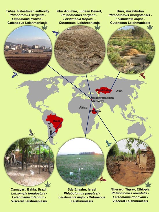 Muỗi cát lưu hành và các loài Leishmania spp., cũng như bệnh mà chúng gây ra cũng được mô tả trên hình.