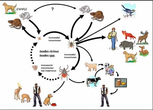·Bệnh Lyme: là một bệnh nặng và thường gây suy nhược cơ thể, do xoắn khuẩn Borrelia burgdorfrei gây ra. Ở nhiều quốc gia, bệnh Lyme đang gia tăng. Bệnh Lyme phát hiện rõ ràng nhất vào năm 1975, đây là bệnh cấp tính là một bệnh giống như cúm có đặc điểm là các nốt ban đỏ lan rộng ở 50% số bệnh nhân, kèm theo sốt, mệt mỏi, đau nhức cơ bắp. vài tuần hoặc thậm chí vài tháng sau khi bị ve đốt, bệnh nhân có thể cảm thấy sưng và đau ở những khớp lớn, viêm não, liệt mặt, tổn thương mắt và viêm cơ tim. Sau đó, có thể là vài năm sau khi bị ve đốt, có thể bị mòn sụn (viêm khớp và rối loạn chức năng thần kinh cơ). Bệnh lưu hành chủ yếu ở các vùng ôn đới phía bắc ban cầu, gồm cả Trung Quốc, châu Âu, Hoa Kỳ, Liên Xô cũ và cũng đã xuất hiện ở Việt Nam. Bệnh chủ yếu do ve Ixodes truyền, phổ biến nhất là vào mùa hè, khi có nhiều thiếu trùng ve. Các loài thú gặm nhấm nhỏ đặc biệt là chuột đóng vai trò nguồn bệnh trong khi các thú lớn chủ yếu đóng vai trò vật chủ nuôi giữ các quần thể ve.