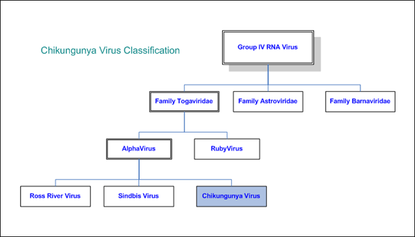 Virus Chikungunya là loại alphavirus với sense single-stranded RNA genome dương tính khoảng 11.6kb. Chúng là một thành viên của phức hợp virus Semliki Forest virus và có liên quan chặt chẽ với Ross River Virus, O’Nyong Nyong virus và Semliki Forest Virus.