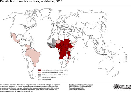 Tháng 3/2014. Tổ chức Y tế thế giới (WHO) - onchocerciasis hay "bệnh mù đường sông" (river blindness) là một bệnh ký sinh trùng gây ra bởi giun chỉ onchocerca volvulus lây truyền qua vết cắn lặp đi lặp lại của ruồi vàng (Simulium spp.) bị nhiễm. Các ruồi vàng sinh sản ở các sông và suối chảy xiết (fast-flowing rivers and streams), chủ yếu ở các làng xa xôi nằm gần mảnh đất màu mỡ, nơi mọi người sống chủ yếu dựa vào nông nghiệp.
