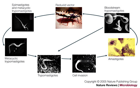 Nghiên cứu dưới đây do tác giả Sherwin F. Wood thuộc đại họcLos Angeles, California tiến hành và báo cáo cho biết: các metacyclic Trypanosoma cruzi chuyển dạng trong mô cơ thành một thể trypanosome mở rộng và dày hơn trong khi những thay đổi từ một thể giống hình dải băng (ribbonlike) sang một thể nhưu hình liềm (crescentic body form), phát triển nhiều hạt volutin và nhiều không bào. Các nhân bị nén phía sau, hình oval, kéo dài thành hình oval và sau đó là tròn, trong khi kinetoplast hình oval lại thành hình tam giác. Sự biến mất của các hình ảnh của trypanosome dẫn đến hình thể khác của ký sinh trùng nhờ vào oc ngắn hơn hoặc biến mất flagellum đi kèm với phát triển của các kinetoplast hình roi, trở thành các ký sinh trùng thể leishmaniform.