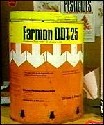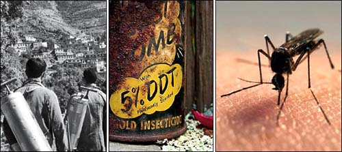 DDT là một trong những hóa chất diệt côn trùng đầu tiên, được sử dụng rộng rãi để phun tồn lưu, có giá thành thấp, hiệu lực cao, bền vững và tương đối an toàn với người. Sự phát minh ra DDT vào khoảng năm 1940 đã góp phần thắng lợi cho công tác phòng chống bệnh sốt rét. DDT có hiệu lực tốt trong việc diệt muỗi truyền bệnh trú đậu trong nhà khi phun hóa chất trên tường vách. Nó có đặc điểm là rẻ tiền và duy trì được hiệu lực tồn lưu diệt trong nhiều tháng. Ở nhiều nước, chương trình phòng chống bệnh sốt rét đã đạt được thành quả bằng cách phun hóa chất DDT vào nhà ở của người dân với một hoặc hai lần trong năm để diệt muỗi truyền bệnh. Tuy vậy, ở một vài vùng, việc phun DDT không duy trì được lâu vì tốn kém chi phí và nhân dân từ chối hợp tác. Ngoài ra, ở một số nơi, muỗi truyền bệnh sốt rét đã tăng tính chịu đựng và kháng lại với DDT. Vấn đề này đòi hỏi phải tăng chi phí để thay thế các loại hóa chất diệt côn trùng khác đắt tiền hơn. Dù sao thì DDT vẫn là một loại hóa chất diệt côn trùng có hiệu quả ở một số nước. Việc sử dụng DDT đã gặp phải sự phản ứng của các nhà bảo vệ môi trường vì xác định DDT có hại khi sử dụng trong nông nghiệp để bảo vệ thực vật vì DDT không bị phân hủy nhanh khi phun lên hoa màu. Nó tồn tại trong đất một thời gian dài và có thể trôi vào các con sông, các nguồn nước. Động vật ăn các loại côn trùng bị ngộ độc DDT, dần dần đến lượt chúng cũng bị ngộ độc. Con người ăn rau quả hoặc các loại thực phẩm bị nhiễm DDT, hóa chất có thể tích trữ trong các mô khác nhau trong cơ thể. Vì vậy, ở hầu hết các nước, DDT đã bị cấm sử dụng. Vấn đề này đã làm hạn chế việc sử dụng DDT trong chiến lược phòng chống bệnh sốt rét, hóa chất này tương đối rẻ tiền nhưng nếu dùng để phun trên tường vách thì vẫn có hiệu quả tốt và tương đối bảo đảm an toàn đối với người cũng như môi trường.