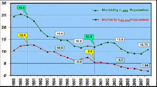 | Hình 3. Tỷ lệ tử vong và tỷ lệ mắc sốt rét ở Myanma giai đoạn 1988 - 2008 |